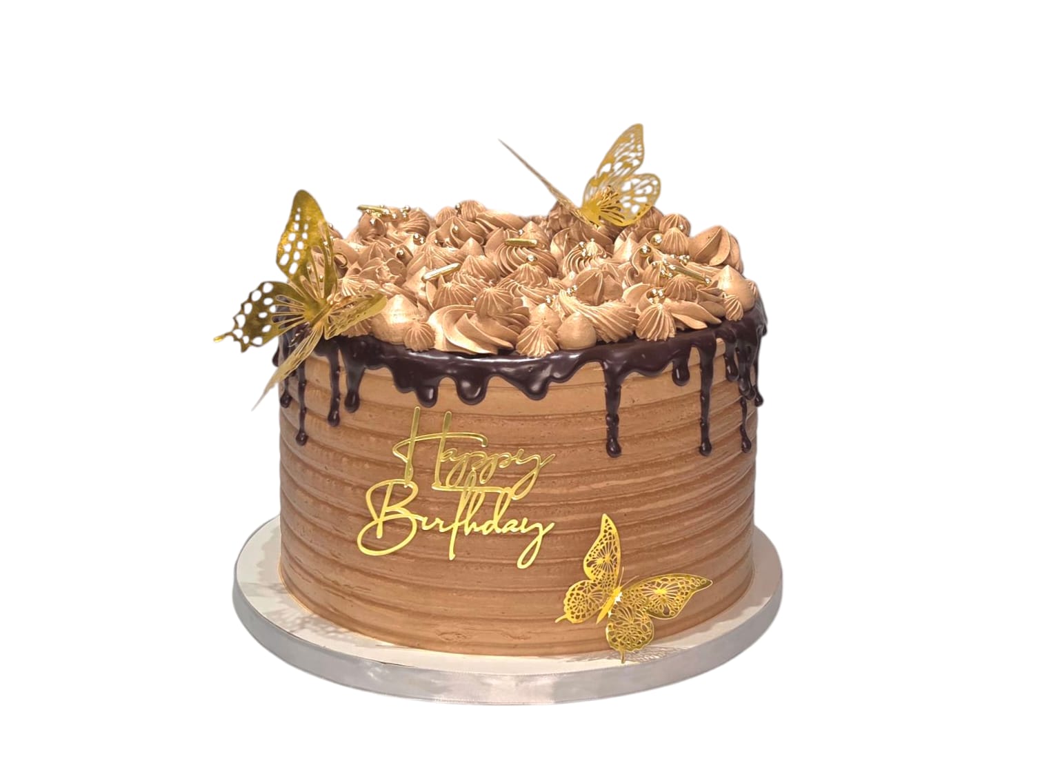 Sponge layers of chocolate cake filled with toffee pieces, and caramel drizzle. Then we finish it with dark chocolate ganache and butter cream frosting.